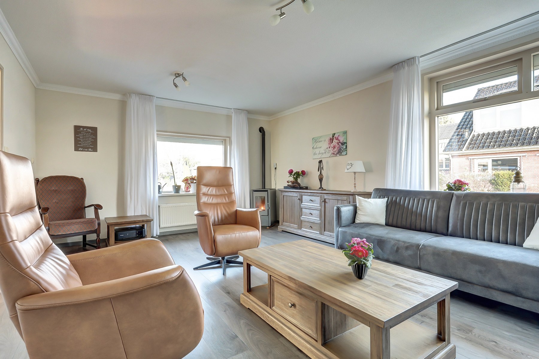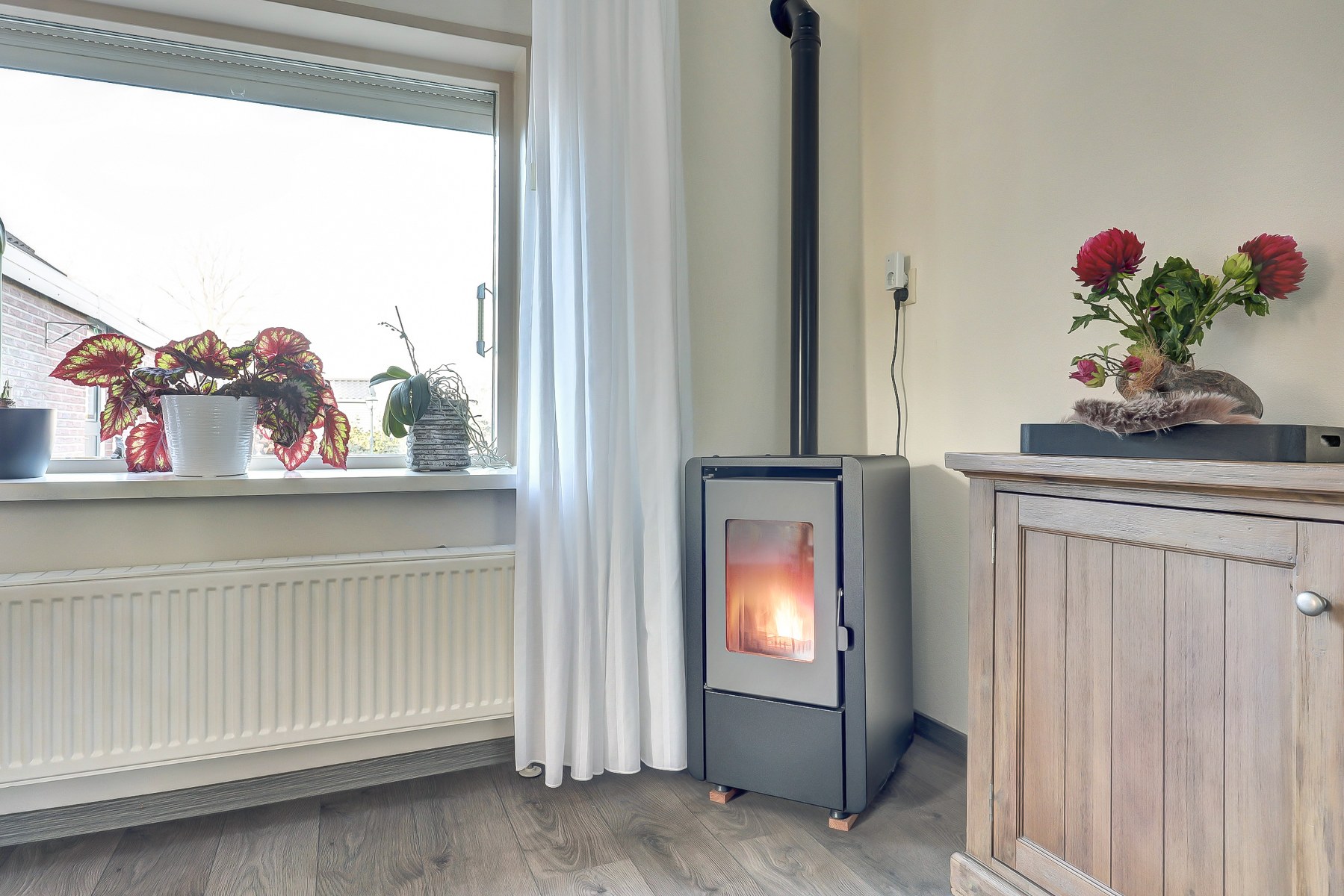 | Verwarming | Middels radiatoren en pelletkachel. |