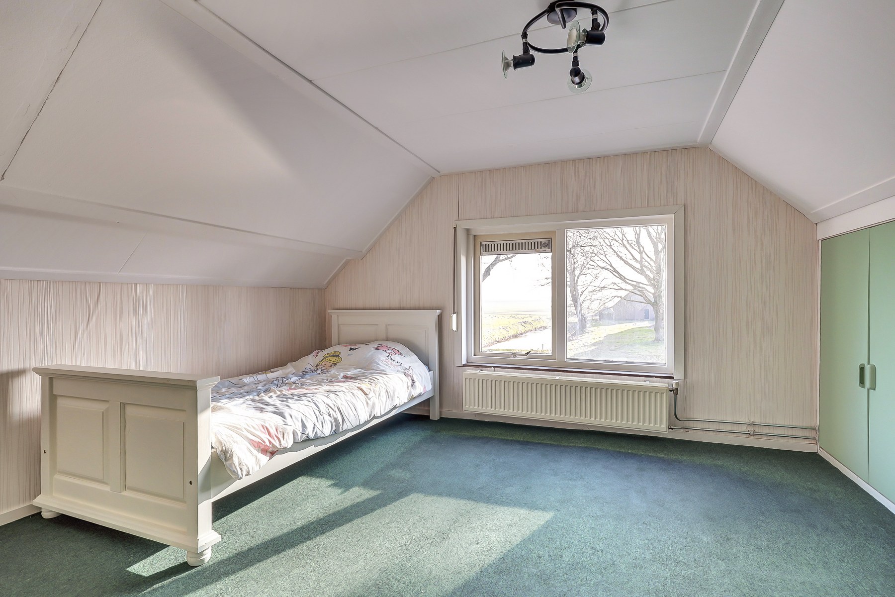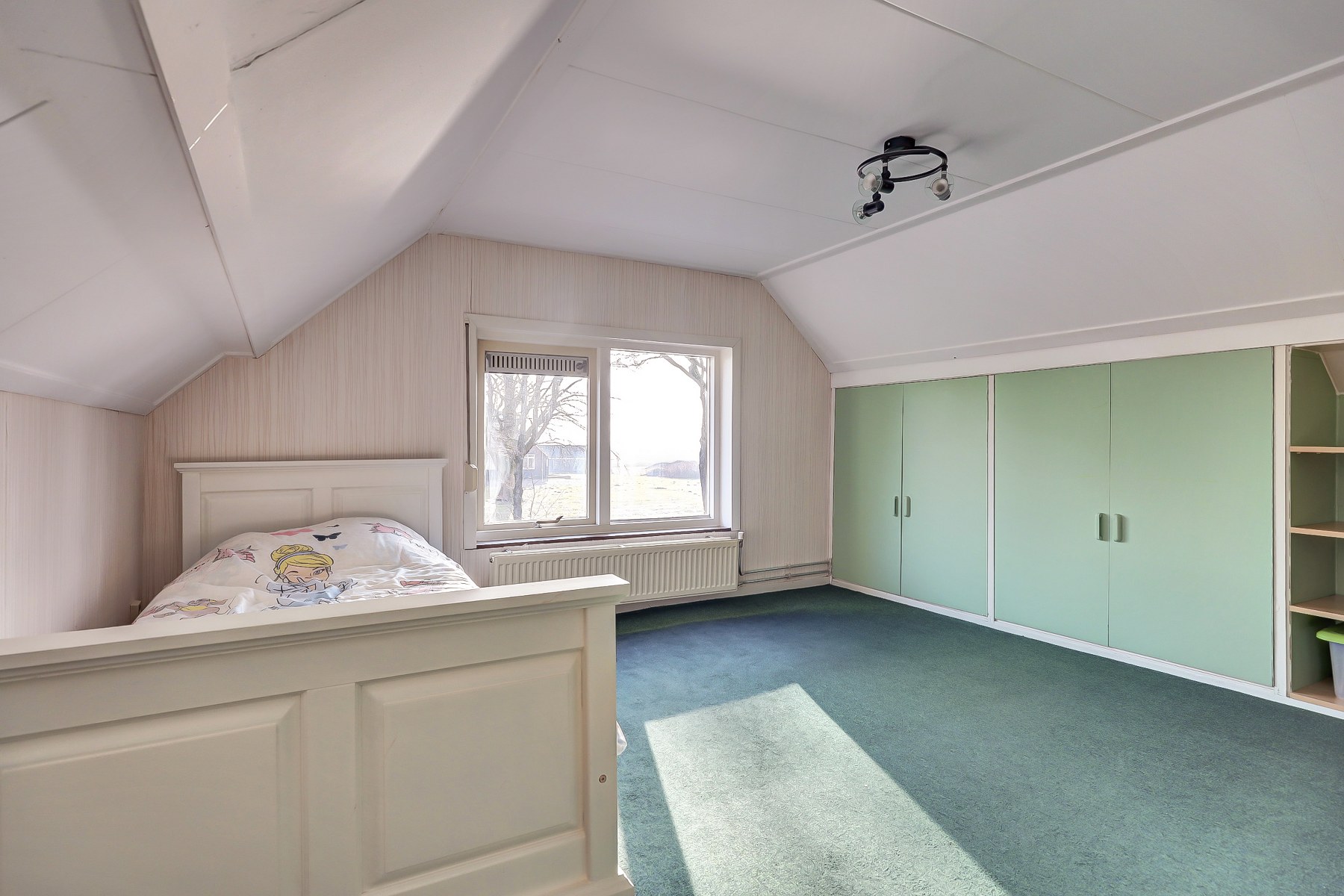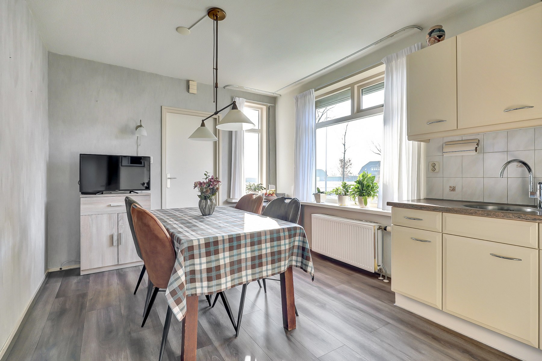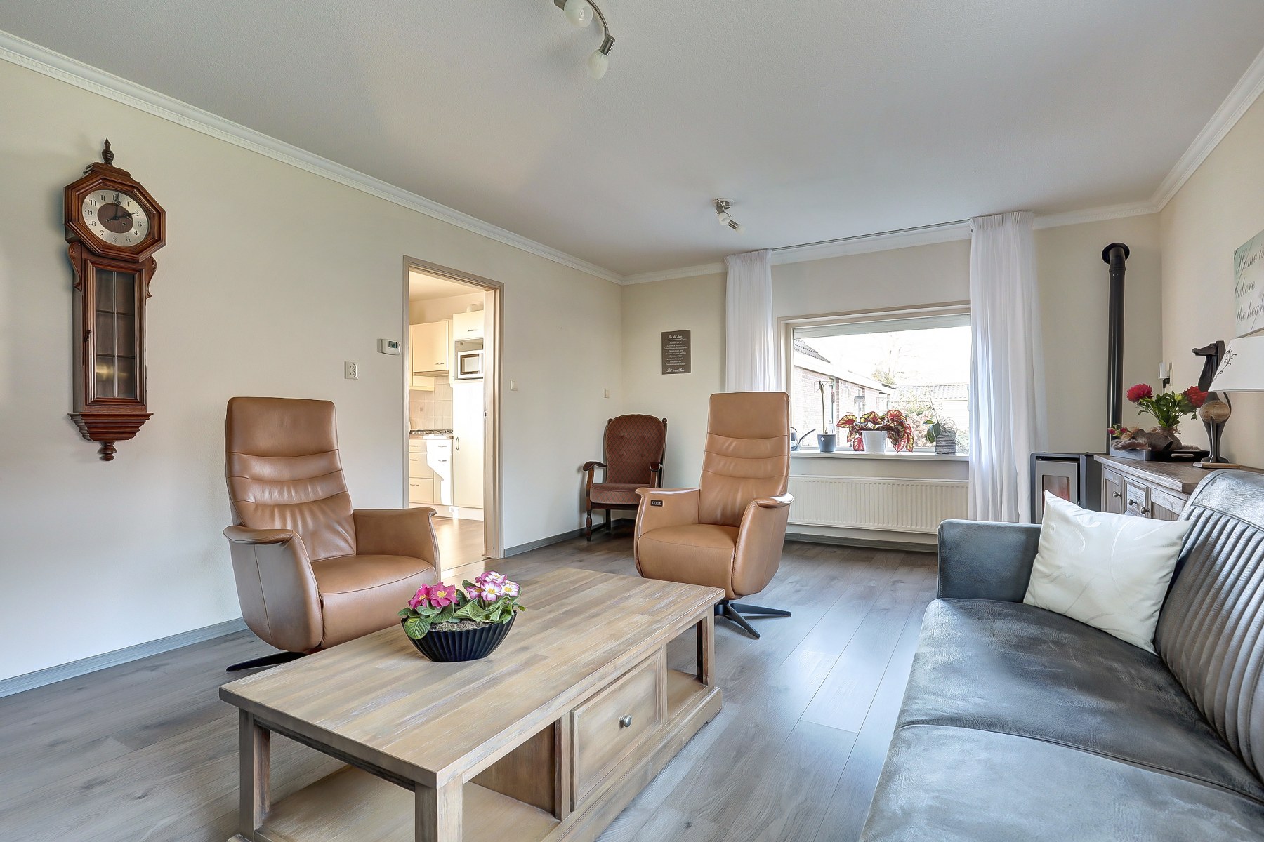 Het volledige woonprogramma bevindt zich op de begane grond, wat deze woning uitermate geschikt maakt voor gelijkvloers wonen. Via de entree aan de zijkant van de woning komt u binnen in de hal met meterkast en glasvezelaansluiting. Op de begane grond bevindt zich een slaapkamer, voorzien van rolluiken voor een goede verduistering en extra comfort. De ruime woonkeuken vormt het hart van de woning en biedt volop plaats voor een grote eettafel, een fijne plek voor lange maaltijden en gezellige momenten. Aansluitend bevindt zich de woonkamer, waar de palletkachel zorgt voor extra sfeer en warmte. Vanuit hier heeft u een prachtig vrij uitzicht over de achtertuin en de landerijen aan de voorzijde. Een uitzicht dat ieder seizoen weer anders is en nooit verveelt. Vanuit de keuken bereiken we de hal met toegang tot het toilet, de bergkast en de badkamer. Zowel het toilet als de badkamer zijn netjes betegeld en verzorgd uitgevoerd. Daarnaast beschikt de begane grond over een ruime berging, praktisch voor opslag of hobbydoeleinden. Ook buiten is het volop genieten. Het royale perceel biedt alle ruimte voor tuinliefhebbers, rustzoekers en buitenmensen. Of u nu wilt ontspannen in de tuin, wilt genieten van het vrije uitzicht of graag ruimte heeft voor hobby’s, hier kan het allemaal. De grote stenen garage met elektrische deur biedt bovendien tal van mogelijkheden, zoals het stallen van een auto, het uitoefenen van een hobby of extra bergruimte.