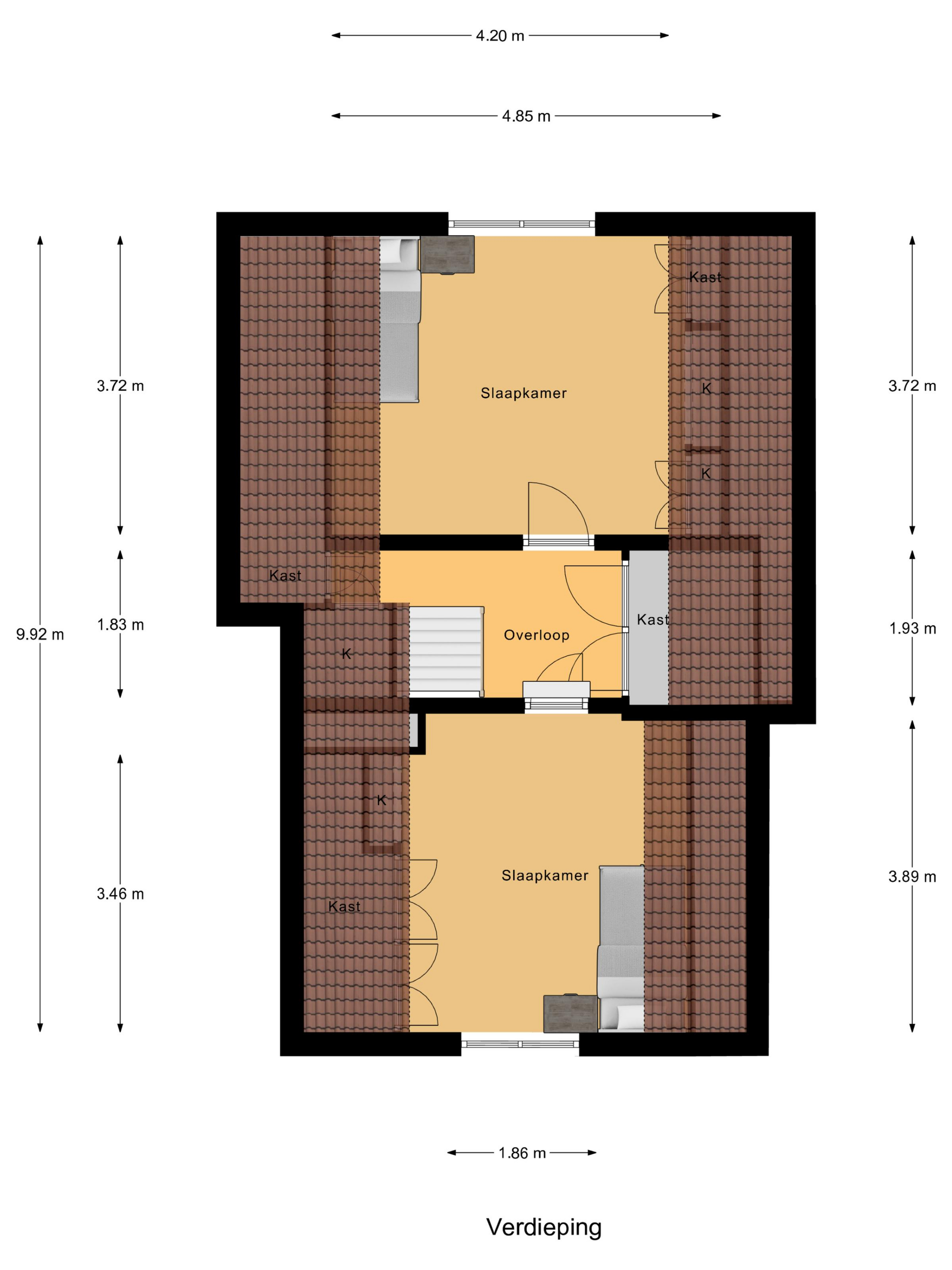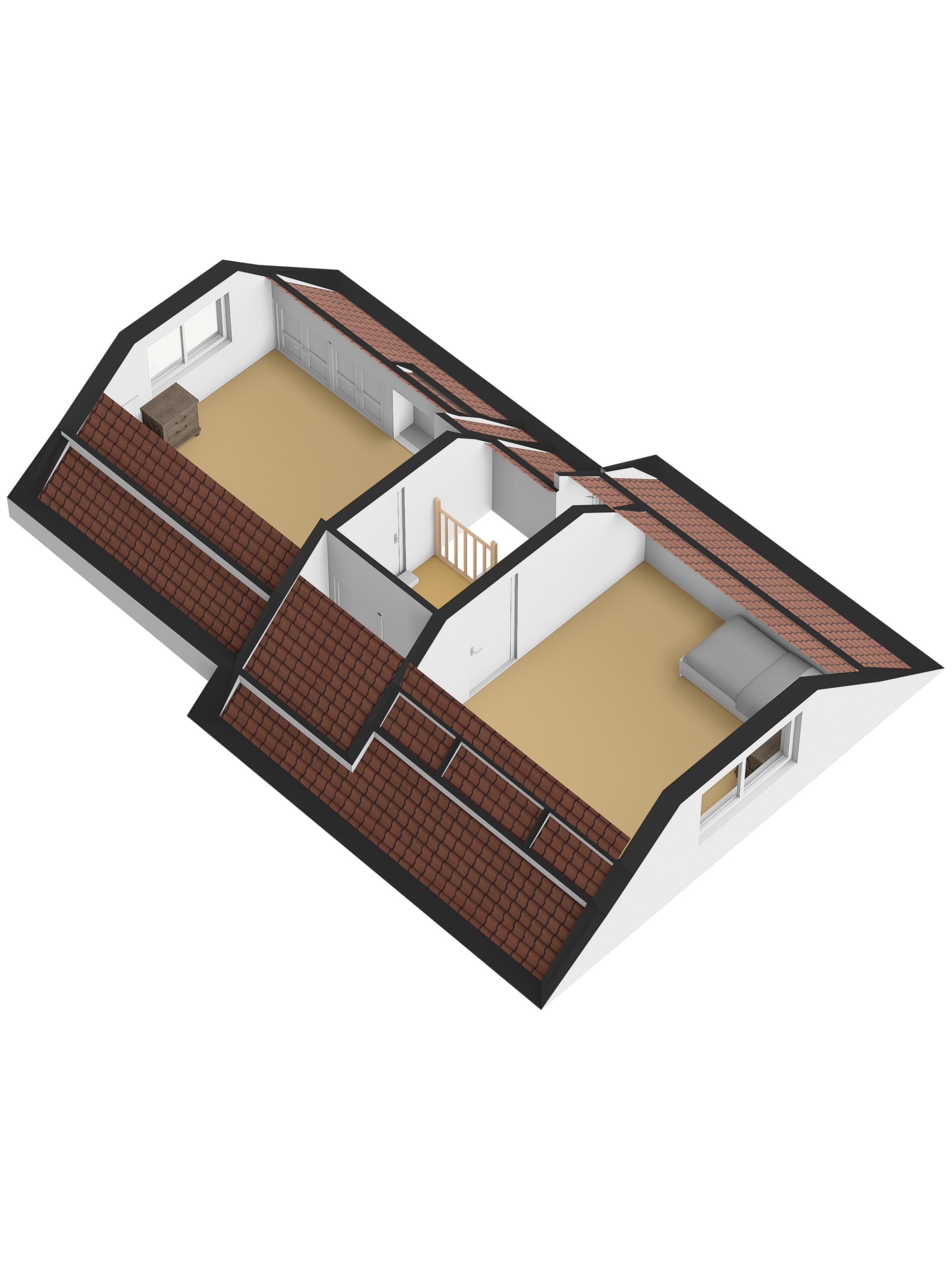 Op de eerste verdieping bevinden zich een overloop en twee slaapkamers. Oorspronkelijk waren dit drie slaapkamers, maar deze zijn later samengevoegd tot twee ruime kamers, ideaal voor logees, (klein)kinderen of hobbygebruik.
