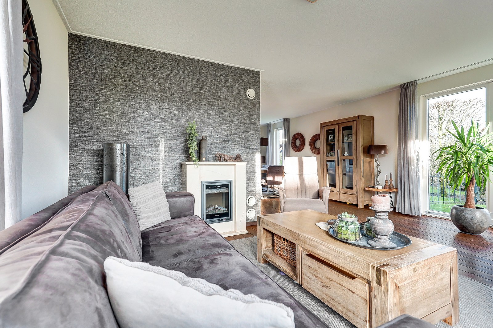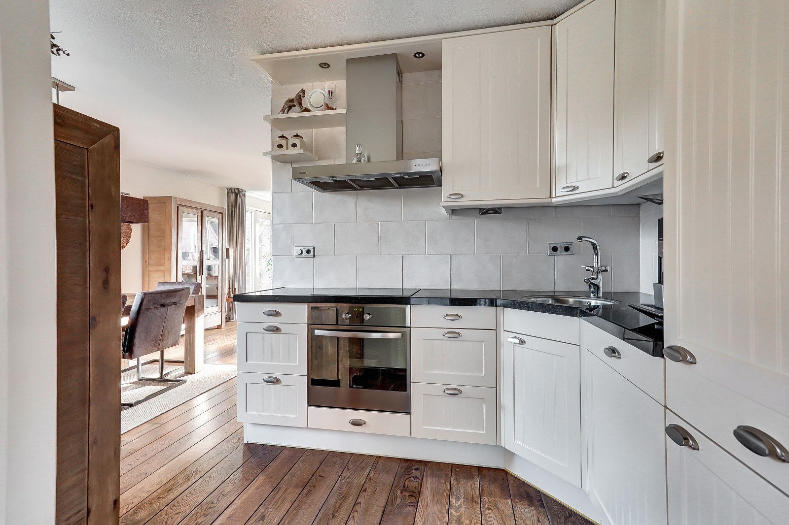 Via de entree met meterkast en trapopgang kom je binnen in de royale woonkamer. Dankzij de grote raampartijen is dit een bijzonder lichte ruimte, waar de massieve eikenhouten vloer direct sfeer en warmte toevoegt. Vanuit de woonkamer kijk je mooi weg over zowel de voortuin als de achtertuin, waardoor je altijd een gevoel van ruimte ervaart. De halfopen keuken staat in verbinding met de woonkamer en is voorzien van alle gemakken: oven, inductiekookplaat, koelkast, afzuigkap en vaatwasser. Een ideale plek om gezellig te koken terwijl je contact houdt met de rest van het gezin of je gasten. Aansluitend bevindt zich de praktische bijkeuken met vaste kast, cv-installatie en aansluiting voor je witgoed. Vanuit hier loop je zo de tuin in, erg prettig voor dagelijks gebruik.